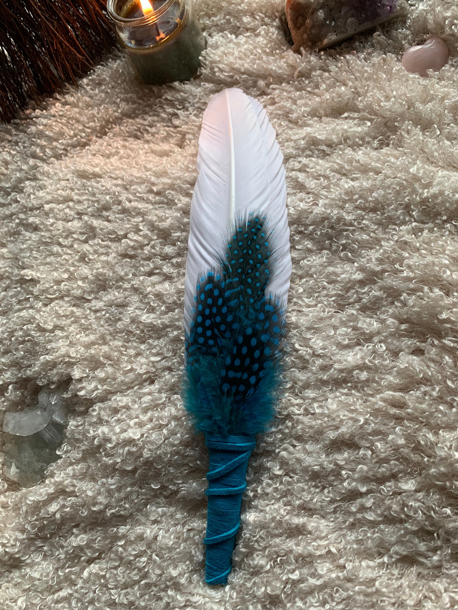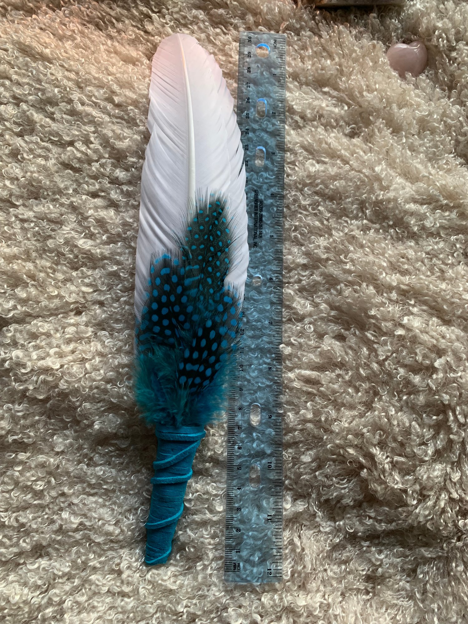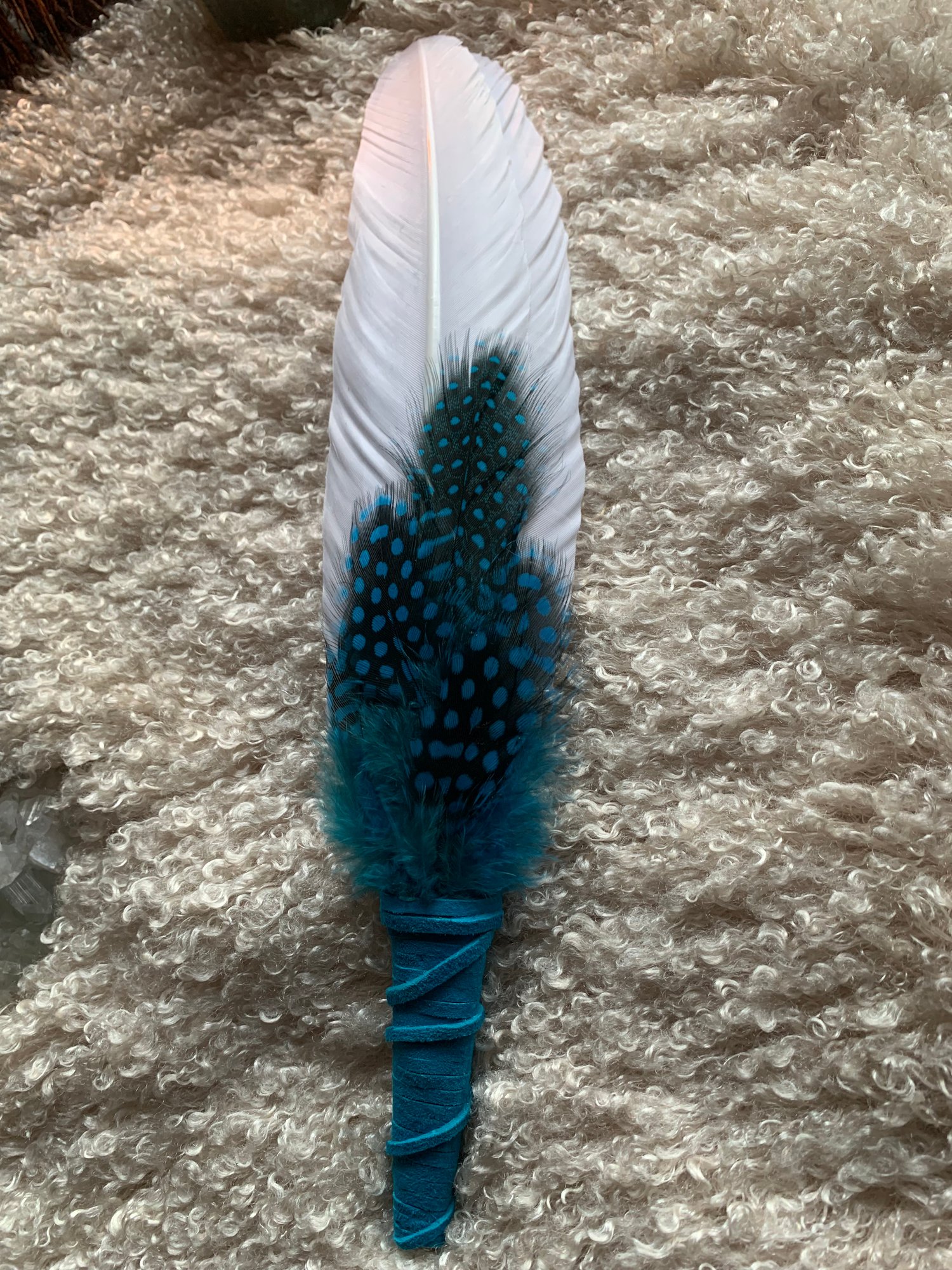This unique original large 11.5” long and 2.5” wide; Turquoise blue suede cord wrapped handle is composed of 2 White Turkey smudge feather accented with 3 turquoise blue new guinea feathers was created by me in January 2023 New moon energy.
